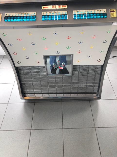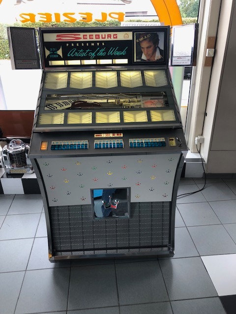 Deze mooie Seeburg DS met oortjes uit het gouden jaar 1962 met zichtbare mekaniek, 160 selecties, 5 jaar waarborg, factuur, levering, gevuld met 80 singles uit te kiezen in onze platenkamer !