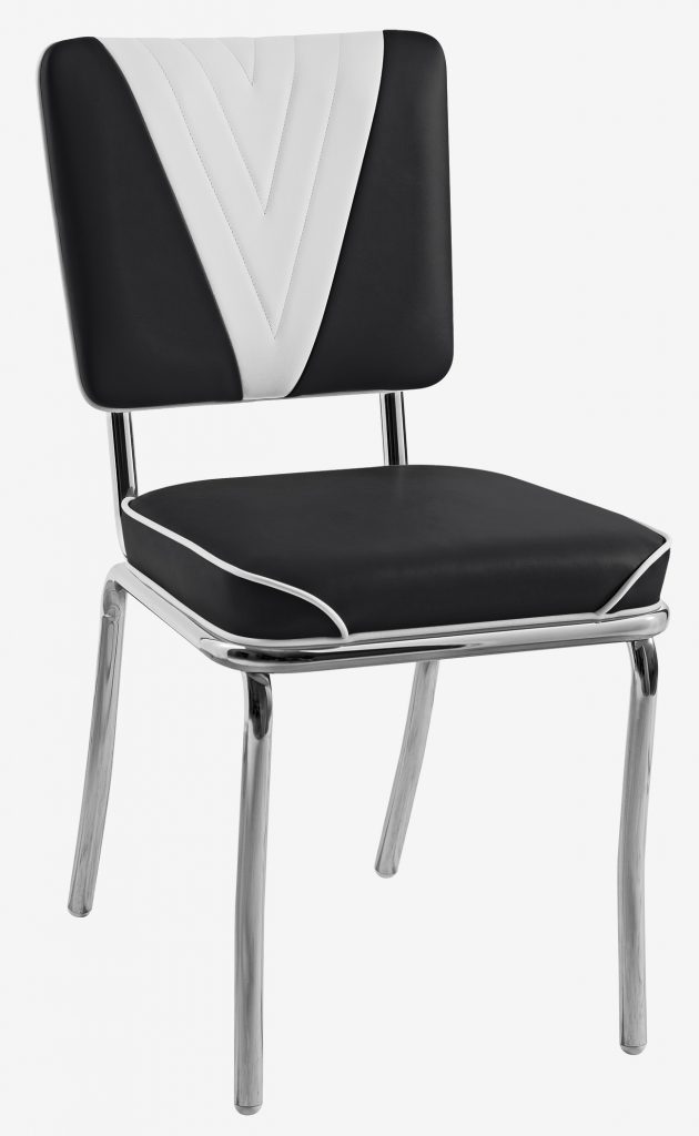 Chair with frame made of steel tube 25 mm diameter, 1.5 mm thick, bent and welded using a robotic system, with trivalent chrome plating finish. Panels made of plywood bent and shaped using heat, self-extinguishing 40Pk density polyurethane on seat, and soft 30 Pk on backrest. Visible seams on backrest with curved herringbone twin-colour effect, upper and lower edges of seat with high quality finish.