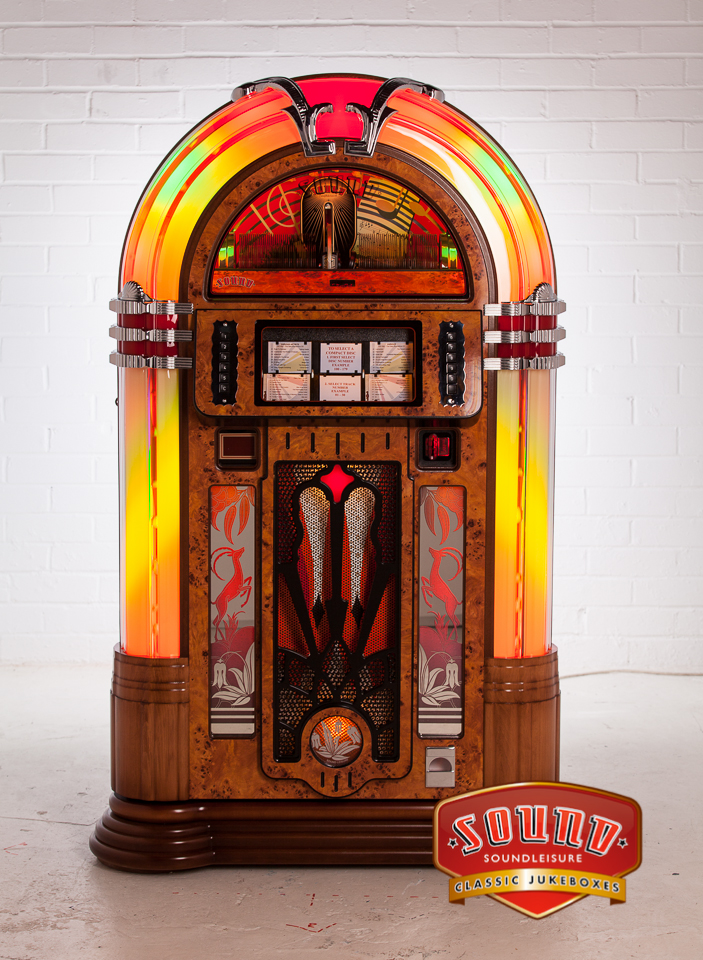 Klein is fijn voor deze jukebox. U hoeft enkel maar te kijken naar de verchroomde details, het glanzende gewei en de met de hand gepolijste houten afwerkingen. Dus als je dit combineert met een vijfwegs luidspreker, stereoversterker en een afstandsbediening, is de Melody moeilijk te weerstaan.
