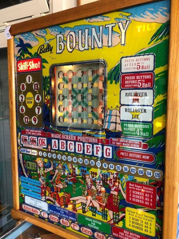 Wij presenteren u deze keer een Bally bingo Bounty uit het gouden jaar 1963. Prachtige nieuwstaat ! Deze machines werden uitgezet in de cafés, bars en casino's als gokautomaat. Deze Bounty is gans herschilderd door vakman alsook een nieuw spiegelglas en herchroomd. Je had verschillende speelmogelijkheden, dus bv. min 3 op rij, maar ook de skill-shot was een spel apart...thuislevering en 5 jaar waarborg inbegrepen. Met deze bingo hoef je niet te spelen tegen of met vrienden, je kan je in je eentje dol amuseren en...je hoeft er geen geld in te steken. Prijs alleen via Jukeboxplezier@skynet.be.