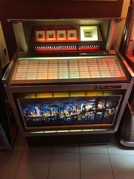 Een Rowe Ami type Music Merchant uit 1967 (met Golden Gate bridge en city lightsdesign), 200 selecties. Prijs is minder dan € 3000 inclusief factuur, thuislevering, 5 jaar waarbord en gevuld met singles.
